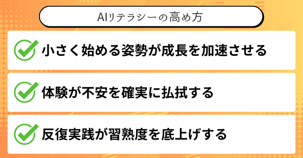 小さな成功体験を積み重ねることが、AIリテラシーを高めるもっとも現実的な方法です。