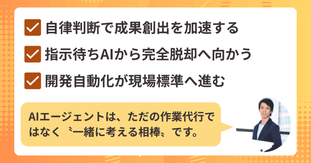 AIエージェントは、単なる効率化ツールではありません。自立して考え、実行する存在として、すでに開発現場や働き方そのものを変え始めています。