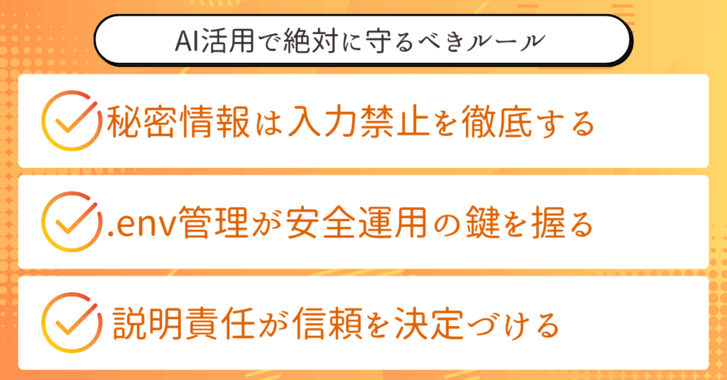 たとえば機密情報を扱う際には、基本原則を守ることが不可欠です。.envによる安全管理などの基礎を徹底することで、リスクは大きく抑えることができます。
