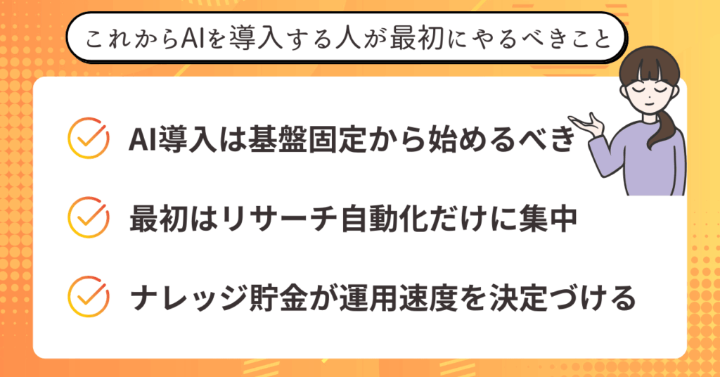 ここまで、AIを活用したローンチ構築、リサーチ、ナレッジ運用の全体像を見てきました。