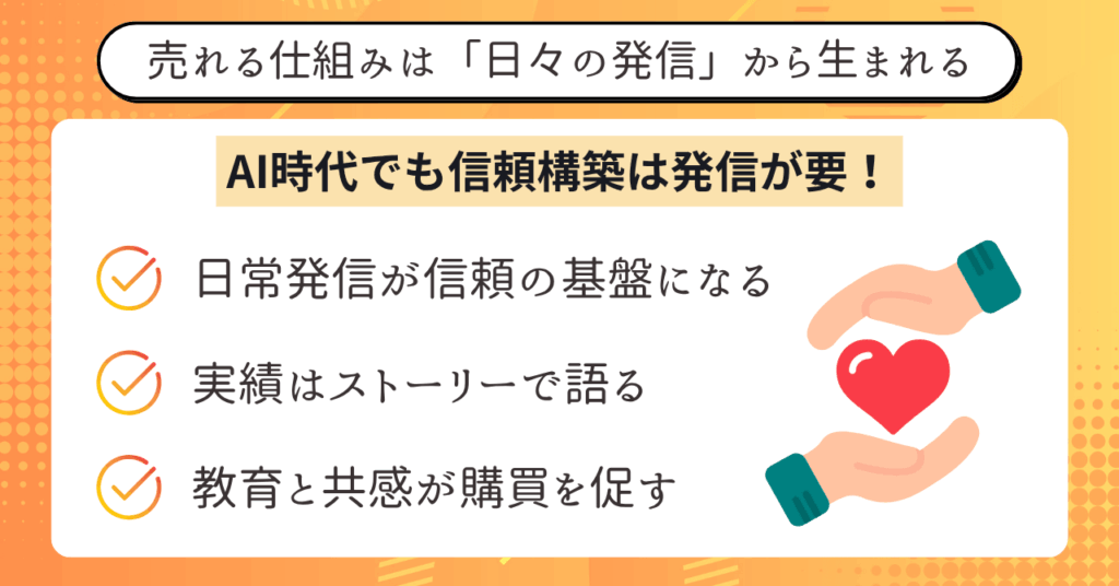 • 教育と共感を先に置くことで信頼が形成されれば、販売は“結果”として成立する