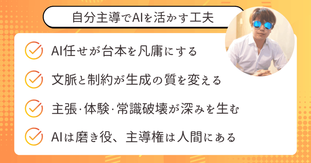 つまり、AIに先に書かせてから“人が整える”のではなく、人が“意図と言葉の重み”を理解したうえでAIに指示を出すべきなのです。