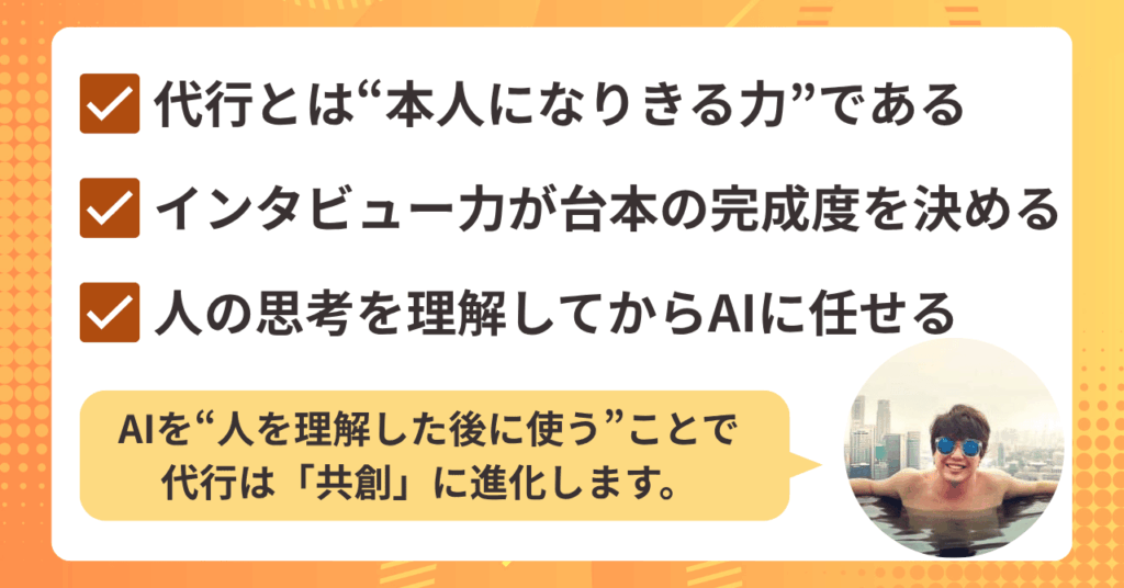 • 代行の本質は「文章を代わりに書くこと」ではなく「思考を代弁すること」