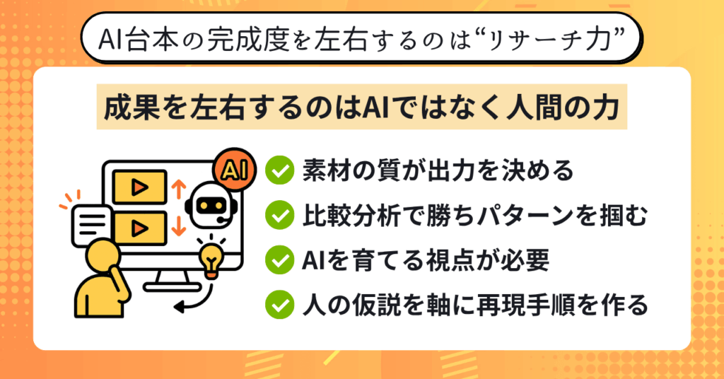 本記事では、AI任せにせず、リサーチ力と分析力を生かして台本の質を高める方法を具体的に解説していきます。