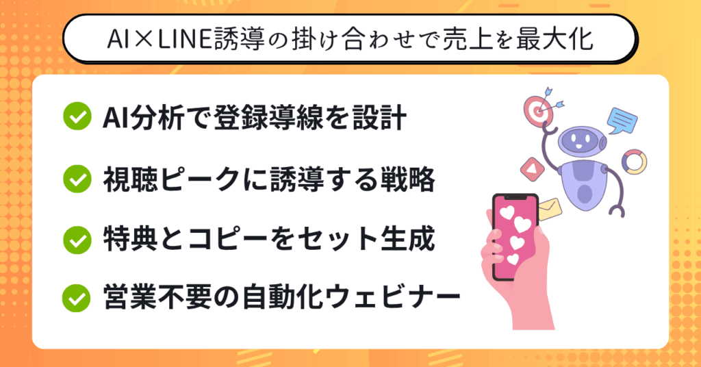 さらに、LINE誘導やオートウェビナーといった仕組み化にもAIを組み合わせ、YouTube台本から売上を生み出す戦略も紹介。