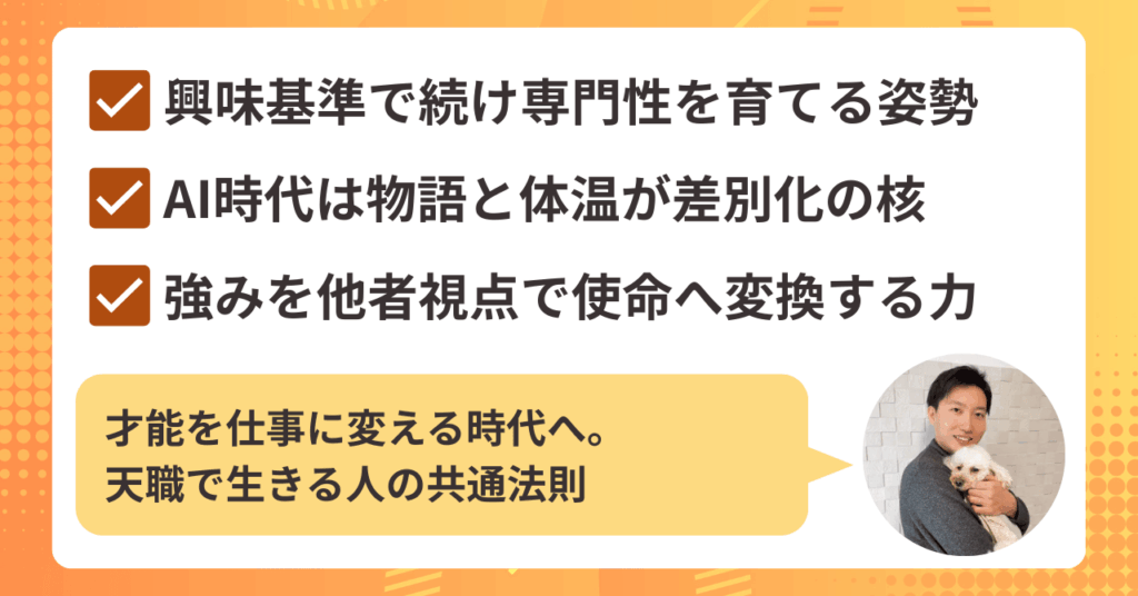 天職を見つけるとは、瞬間的な好きに飛びつくことではなく、「長く追いかけても飽きないテーマ」を選ぶことに他なりません。