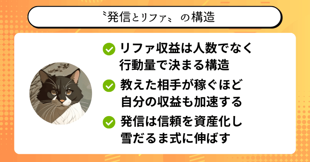 そして最終的に、稼ぎが加速する人は〝発信とリファ〟の構造を理解しています。