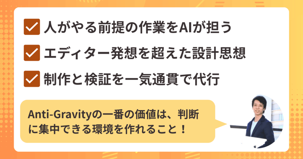 Antigravityは、作業を楽にするための道具であると同時に、〝人間の仕事の本質〟を浮き彫りにする存在です。