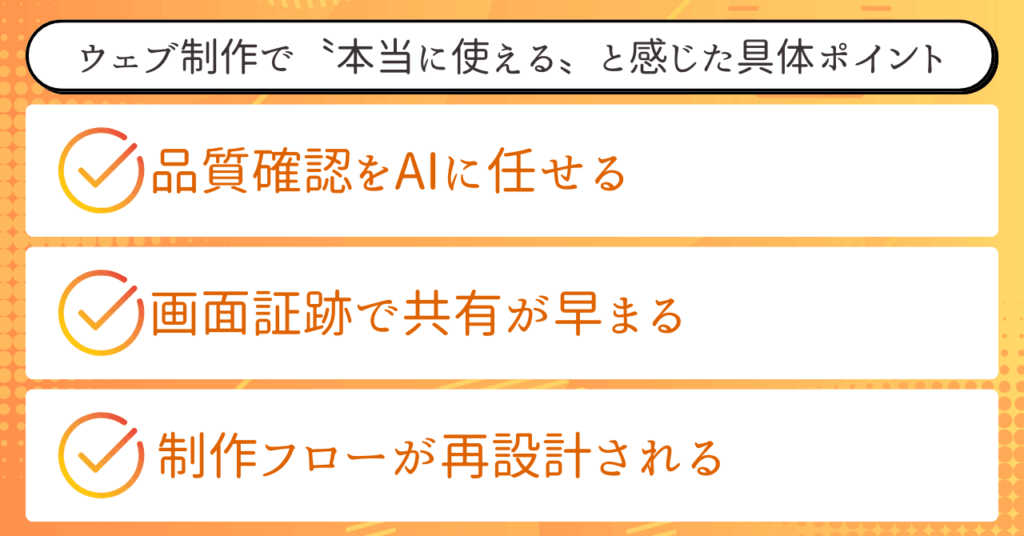 さらに、ブラウザ操作の精度が高いため、ウェブ制作における〝品質チェック〟や〝検証作業〟まで任せられるようになりました。