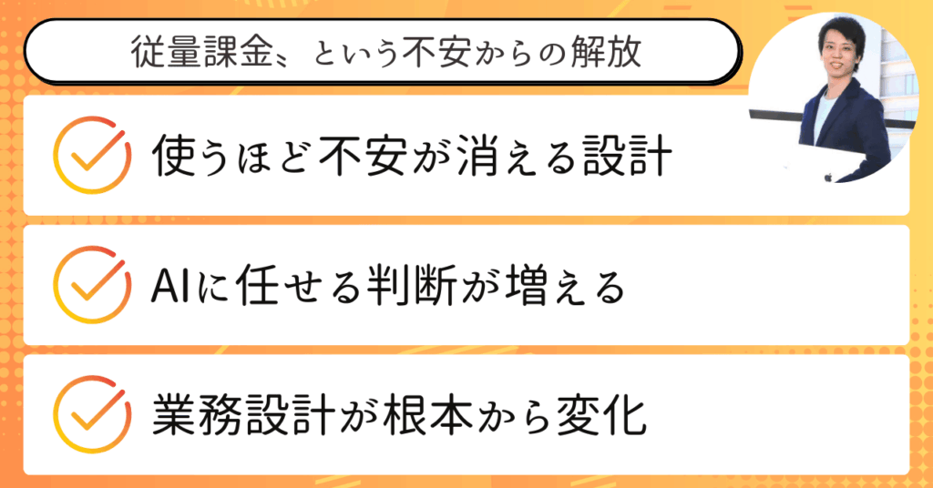 従来のAIツールでは、使えば使うほど〝従量課金〟が積み重なり、「便利だけど、請求額を見るのが怖い」という声も少なくありませんでした。