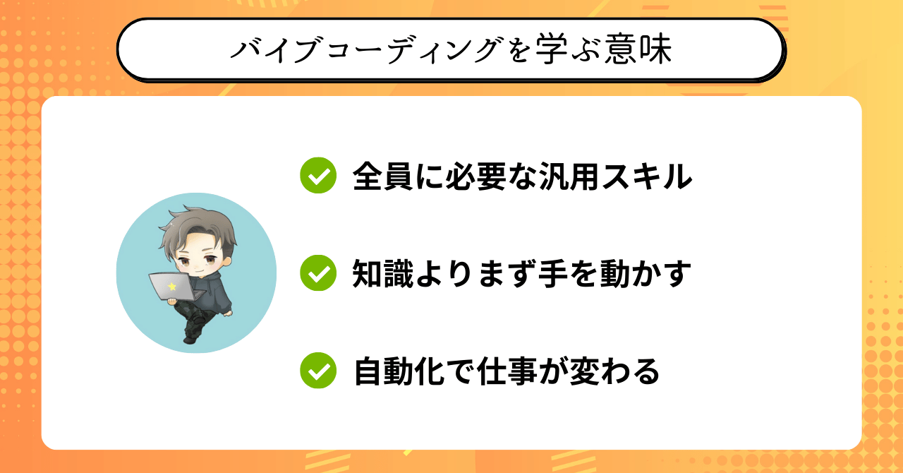 なぜならバイブコーディングは、特定の職種だけのスキルではなく、あらゆる仕事の〝補助輪〟になる技術だからです。