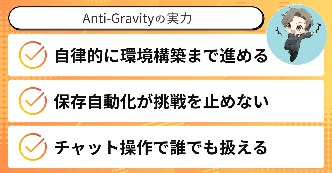 つまり、Antigravityが選ばれた理由は、性能差というより〝最初にハマれたかどうか〟という感覚的な部分が大きいのです。