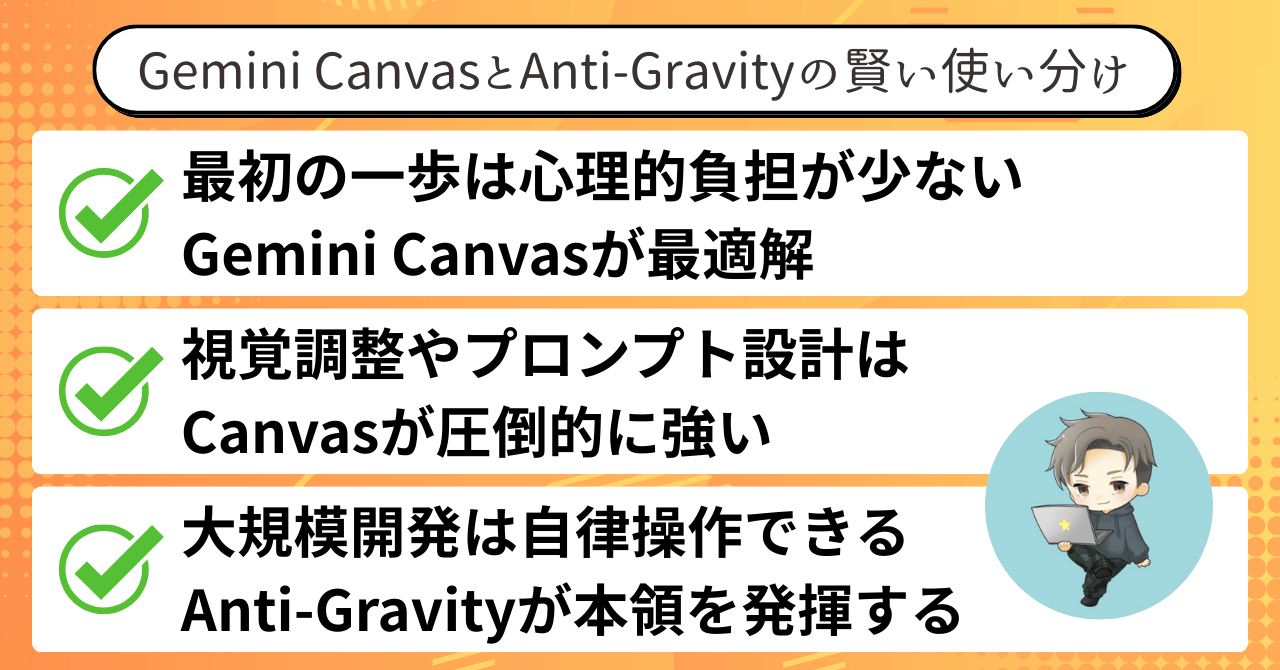 AntigravityやGemini Canvasは、技術力を誇示するためのツールではなく、日常の不便を軽くするための手段です。