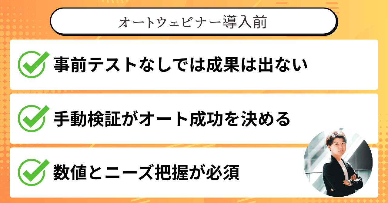 まずは、〝完璧なオートウェビナー〟を目指す前に〝不完全な手動セミナー〟を経験することが重要です。