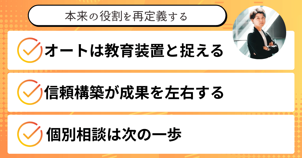 だからこそ重要なのは、オートウェビナーを〝売るための最終兵器〟ではなく、〝信頼を積み上げる教育装置〟として正しく位置づけることです。