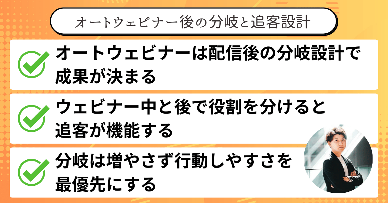 そして、ウェビナー単体で完結させず、視聴後の分岐や追客まで含めて一貫した導線を設計する。