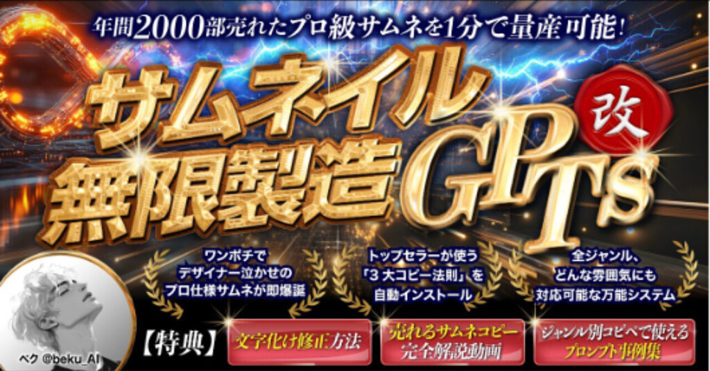ベクさんのBrainサムネイル無限製造GPTsでは、サムネイル制作の悩みをすべて解消し、誰でも1分で「売れるサムネ画像」を量産できるGPTsとノウハウを体系的にまとめています。