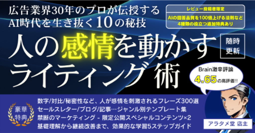 アラタメ堂さんのBrain【800部突破】広告業界30年のプロが伝授するAI時代を勝ち抜く10の秘技『人の感情を動かすライティング術』では、AI時代でも通用する「人の感情を動かす文章術」を、30年の広告経験とAI分析にもとづいて体系的に解説しています。