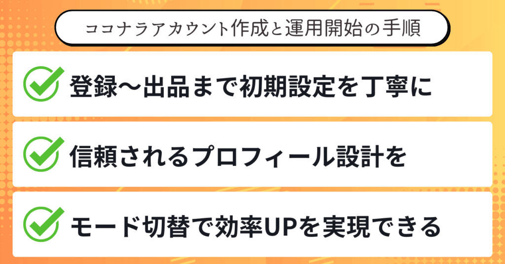 ここからは、ココナラで実際に活動を始めるためのアカウント作成〜運用開始までの実務ステップを解説します。