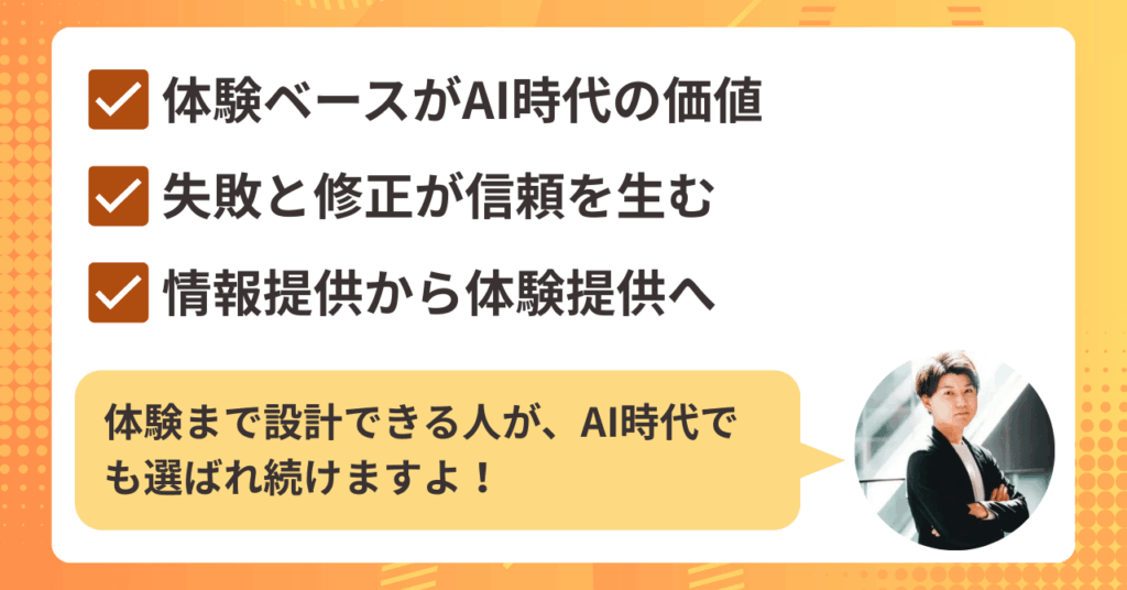 AI時代においては、情報の量よりも、〝体験〟や〝再現性〟、そして〝信頼〟が価値の中心になります。