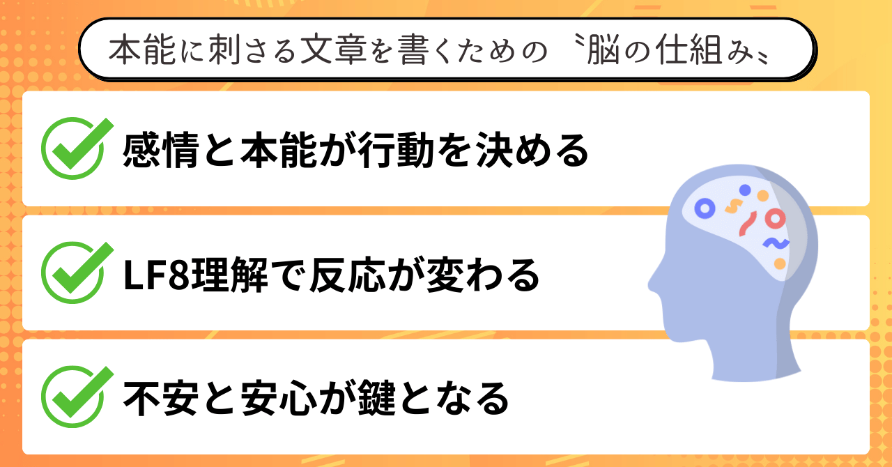 さらに、読者のタイプ別に刺さる伝え方や、本能に直接訴えかける文章設計の考え方まで踏み込んで解説します。