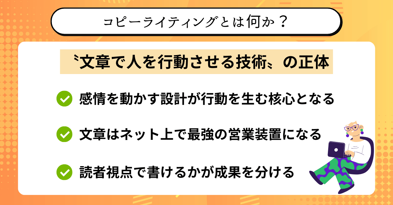 コピーライティングを一言で表すなら、〝文章で人を行動させる技術〟です。