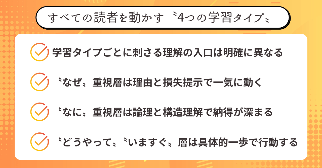 読者の心理を理解し、学習タイプの違いを考慮し、タイトル・導入・本文・ストーリーを一つの流れとして組み立てる。