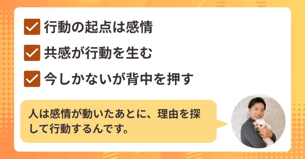 人は論理で納得して買うんじゃありません。 感情が動いたあとに、理由を探して行動するんです。