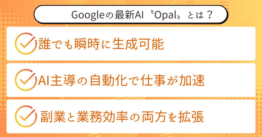 ここまで、Googleの最新AI〝Opal(Opal)〟の使い方と活用事例を紹介してきました。