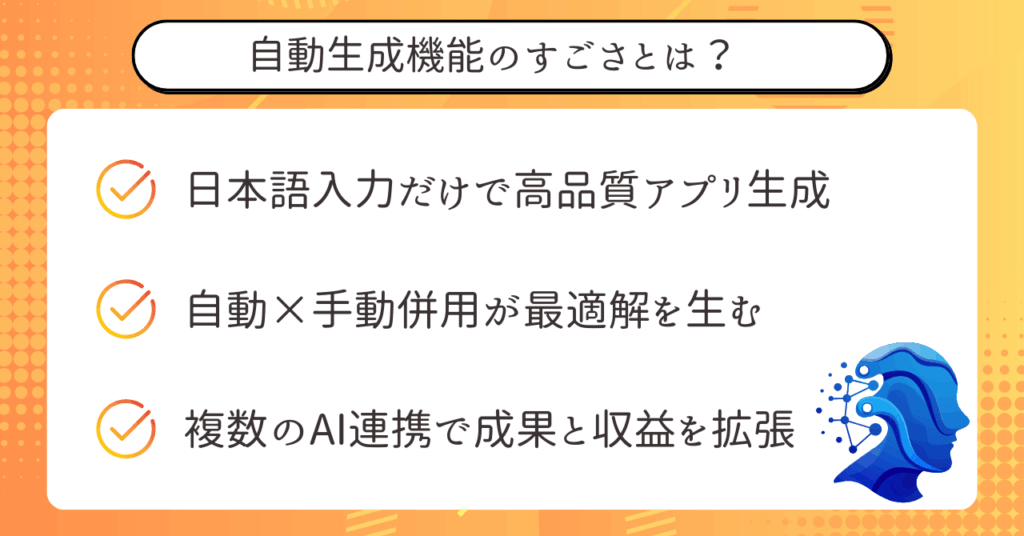 「こういうアプリを作りたい」と指示するだけで、AIが自動で構築してくれます。