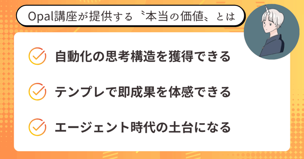 ただし、Opal講座の価値は、単にツールの使い方を学べることではありません。