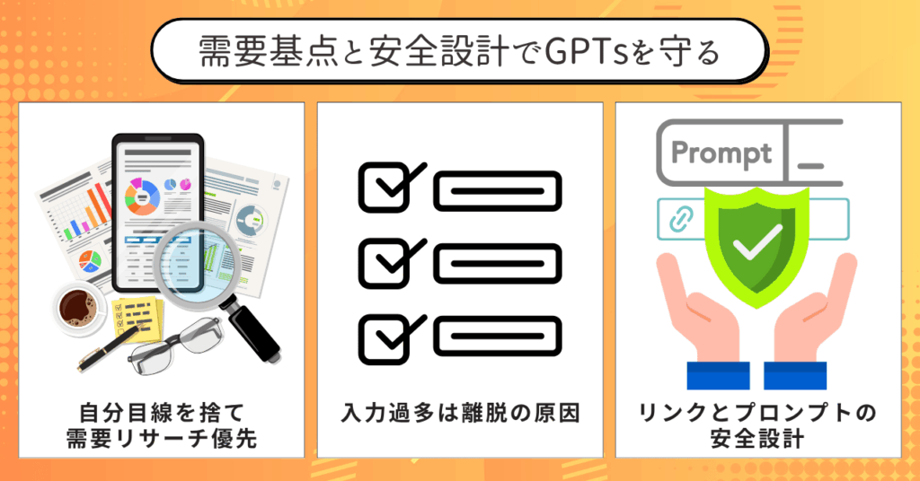 需要リサーチ・ユーザー体験・安全性の3点を柱に設計を行うことで、長期的に信頼されるGPTsを運用できます。