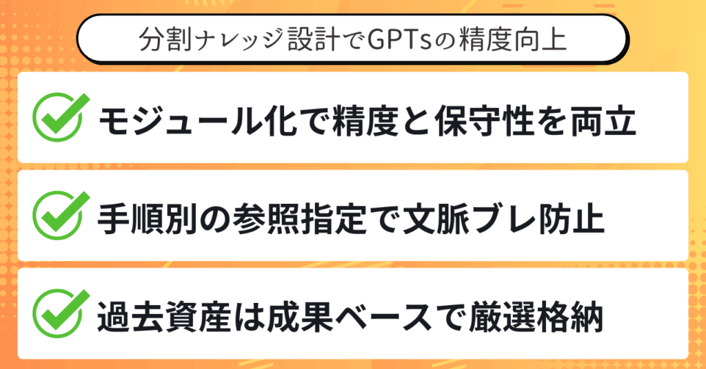 汎用的な文脈や専門情報を内部ナレッジとして統合しておけば、ユーザーが入力しなくてもGPTsが自動で補完できます。