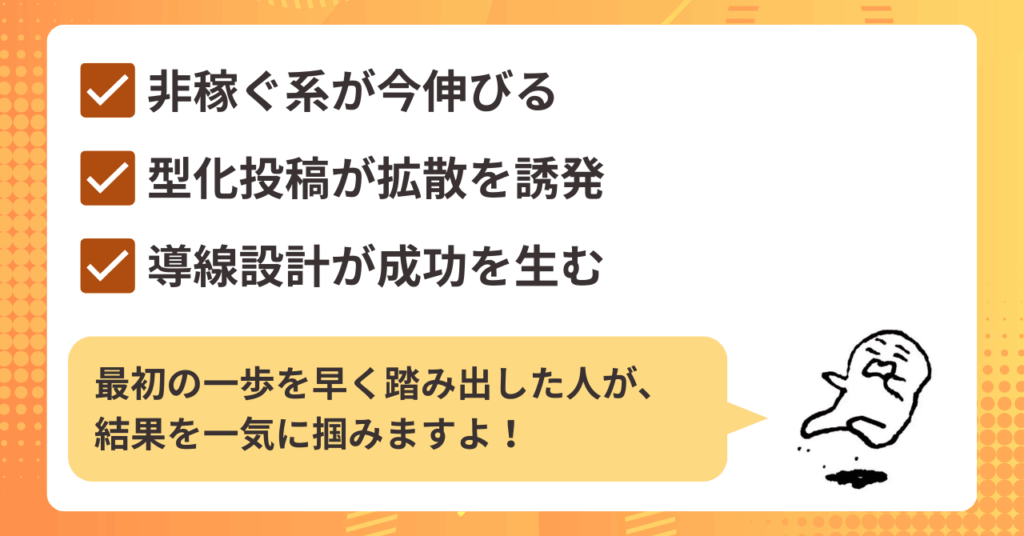 非稼ぐ系は「バズる仕組み」がすでに完成しているんです。最初の一歩を早く踏み出した人が、結果を一気に掴みますよ!