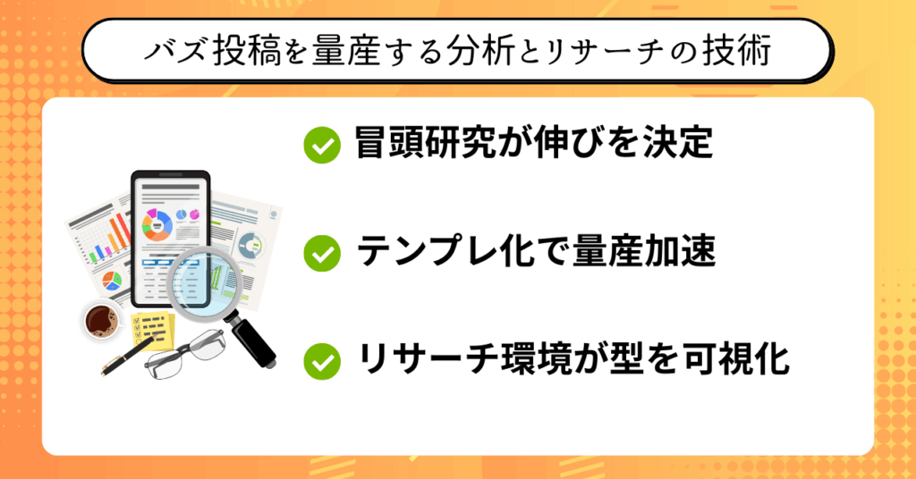 また、バズ投稿の量産はリサーチとテンプレ化によって安定して実現できます。
