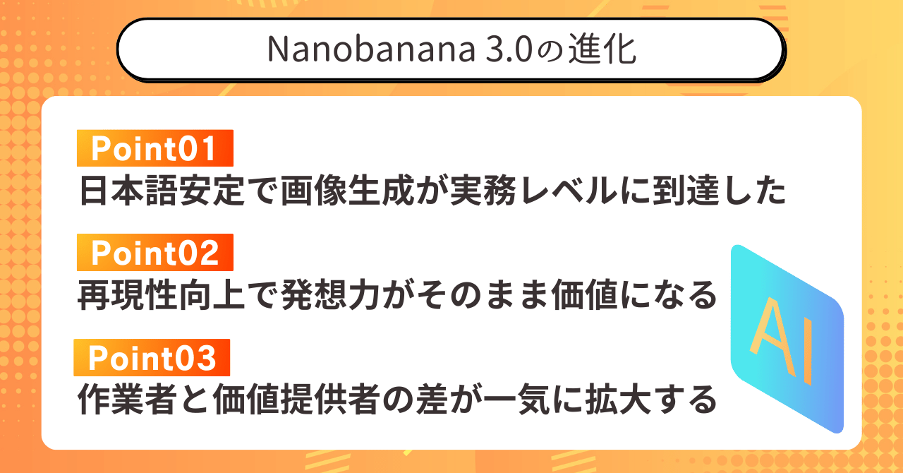 Nanobanana 3.0の進化によって、アイデアを形にするハードルは大きく下がりました。