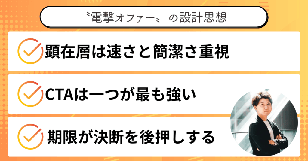顕在層に対しては、説得よりも迷わせない導線とシンプルな電撃オファーが効果を発揮します。