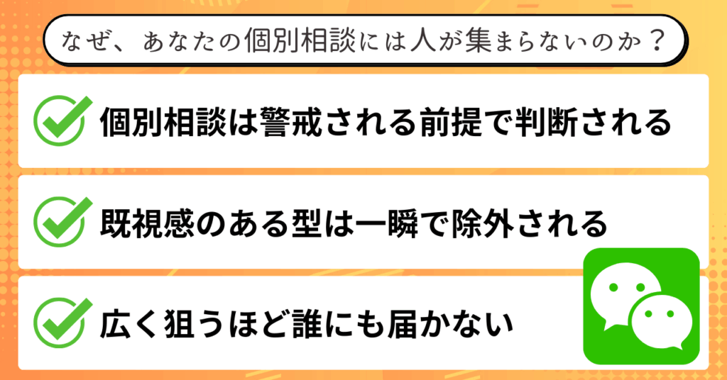 個別相談が入らない原因は、能力や実績ではなく、この前提を理解せずにオファーしてしまうことにあります。