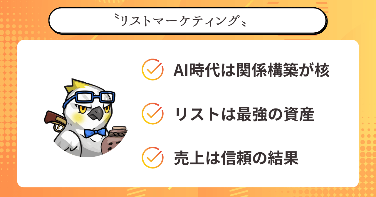 また、AI時代においても変わらず重要なのが、リストマーケティングを通じた〝関係性の構築〟です。