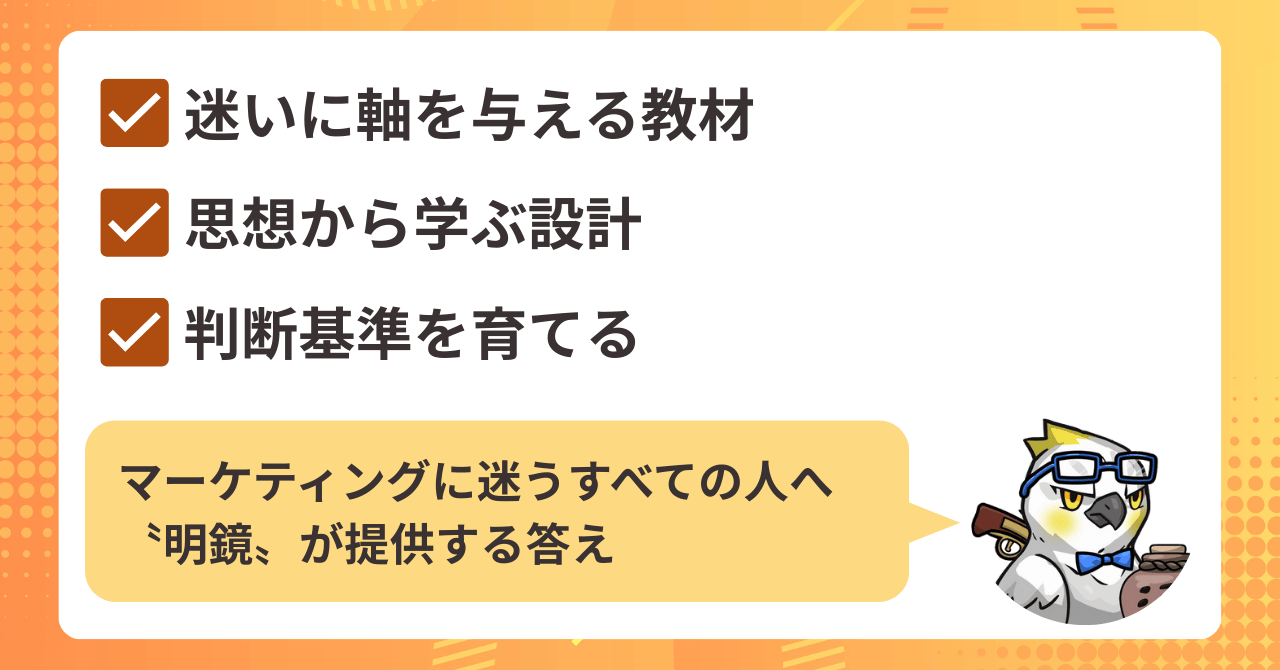 『明鏡』が目指しているのは、〝手段を覚えるマーケター〟ではなく、〝問い続けられるマーケター〟を育てることです。