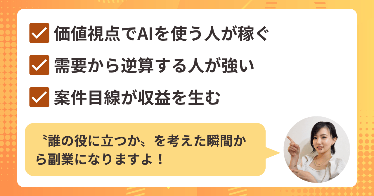 この視点を持つだけで、AIは一気に〝稼ぐ道具〟へと変わります。