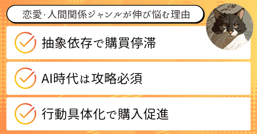 さらに、恋愛・人間関係ジャンルのように一見抽象的で難しそうに見える分野でも、実践に基づく具体的な攻略要素を含めるだけで、内容は一気に価値あるものへ変わります。