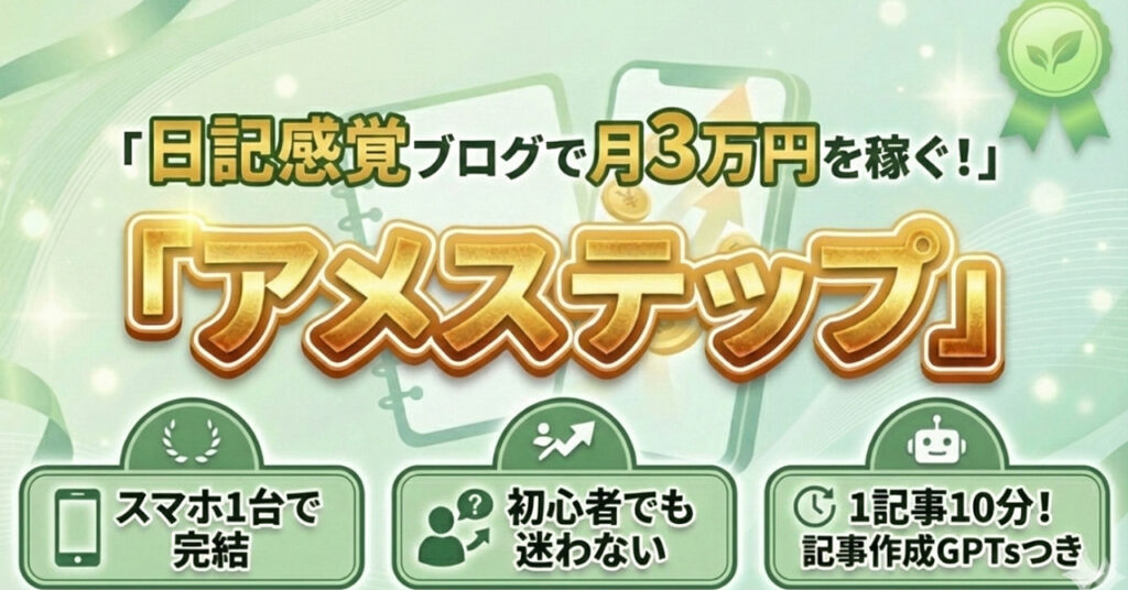 第10位:スマホ1台でできる!日記感覚ブログで月3万円を稼ぐ『アメステップ』