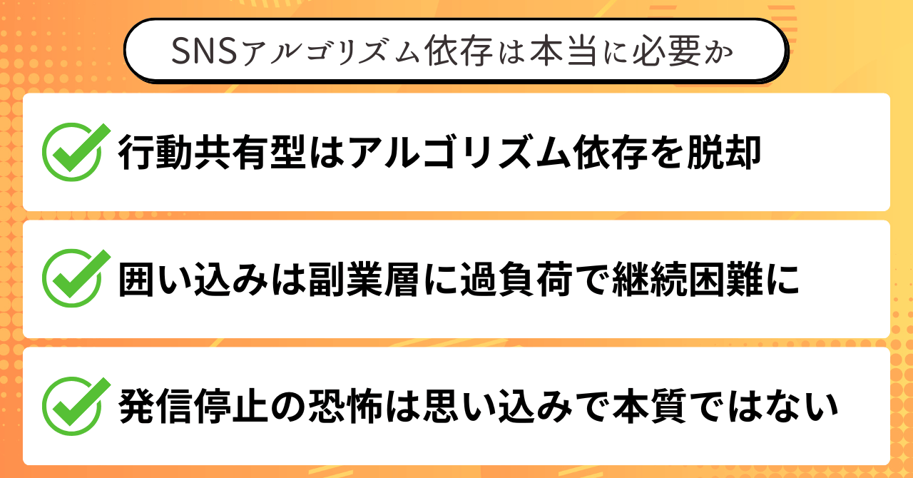 この環境で同じ戦い方をすれば、タイムラインは似たような投稿で埋まり、読者は判断疲れを起こし、最終的には誰の発信も深く読まなくなります。