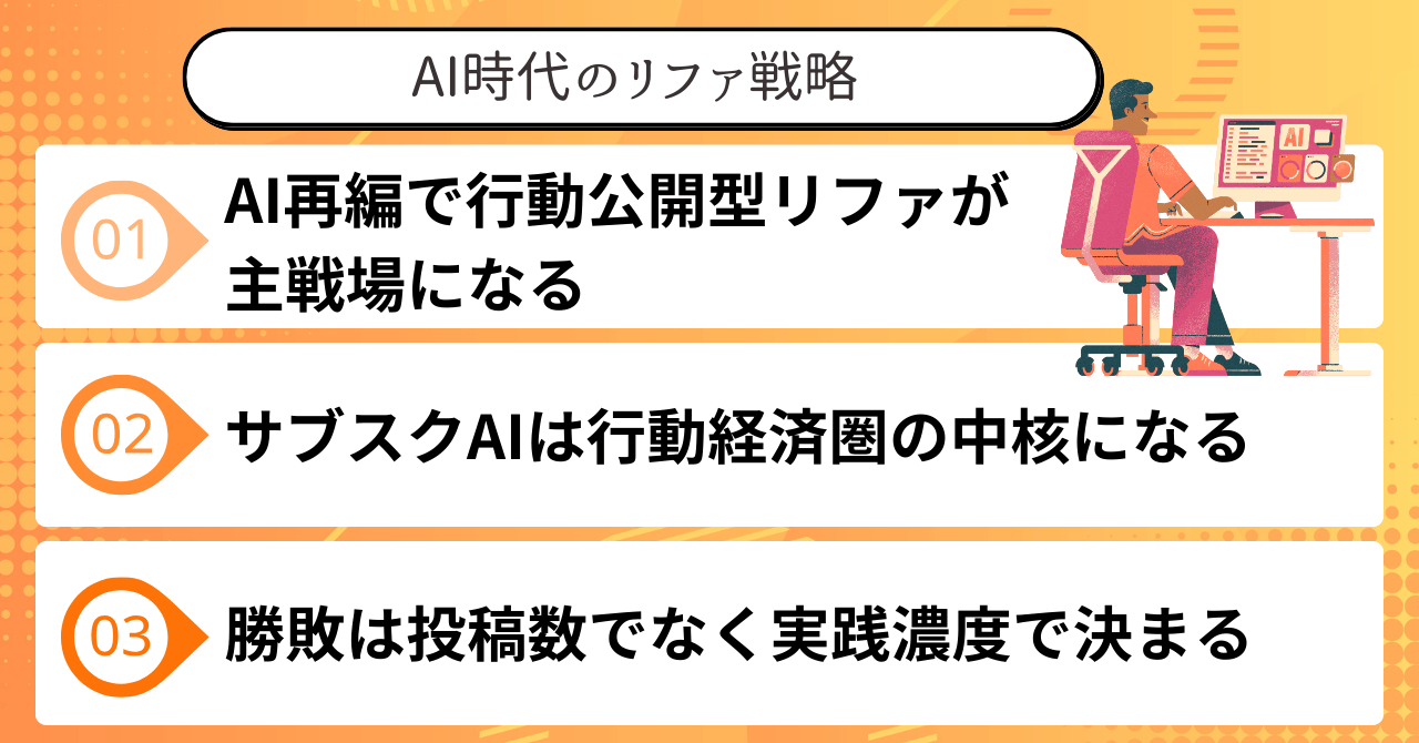 サブスク型AIリファが広がれば、市場は再び横並びに近い状態になり、その中で勝つ人は、行動を隠さず公開し、再現可能な形で示せる人になります。