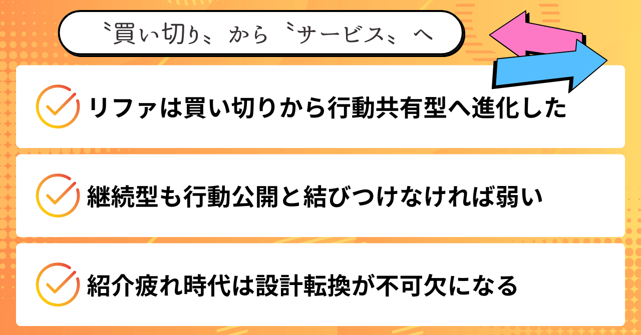 これからのリファ戦略は、商品を売る戦いではなく、自分の行動を歩かせる戦いです。
