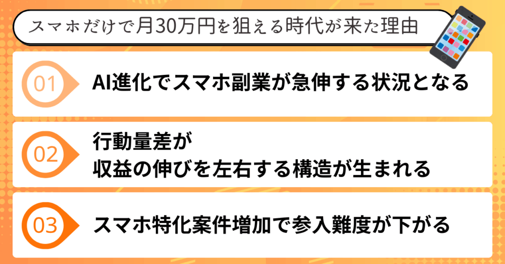 特にAIツールの普及によって、スマホで完結する副業の種類が大幅に増えたことが大きな理由です。