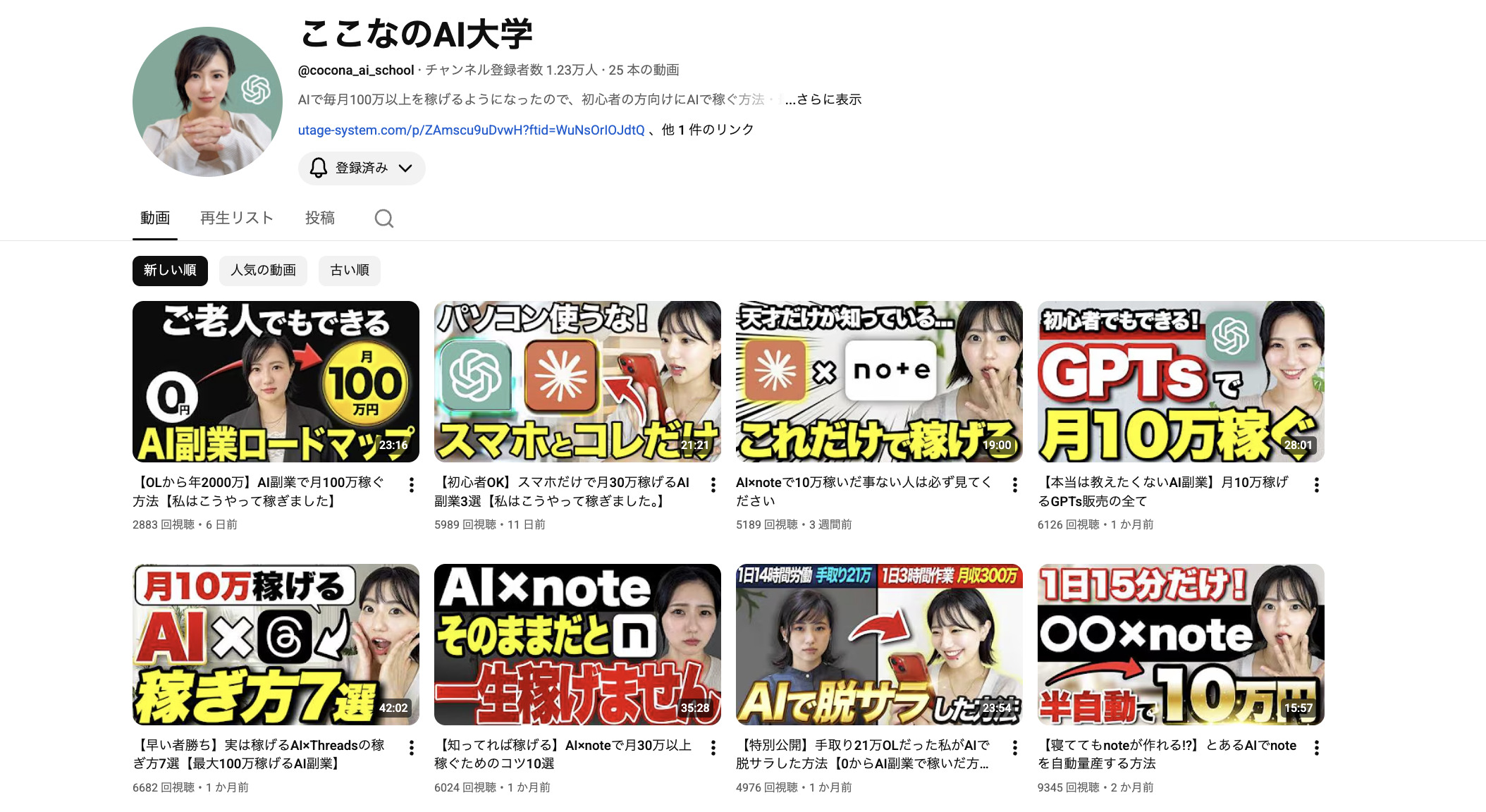 ここなさんのYouTubeチャンネル『ここなのAI大学』では、初心者の方向けにAIで稼ぐ方法・最新情報を発信しています。