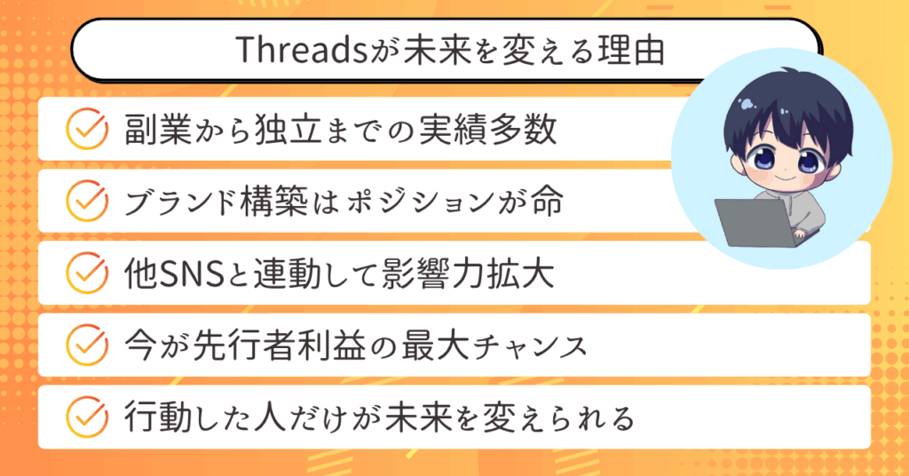 副業から独立に至った事例や、フォロワー増加・収益化の実績が示すように、Threadsは努力を形に変える力を持っています。
