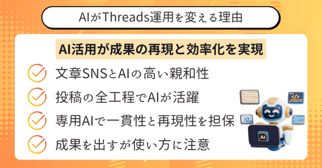 さらに、文章特化のSNSであるThreadsはAIとの相性が抜群で、投稿作成を効率化できます。